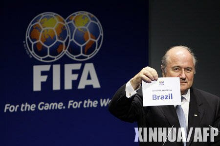 FIFA President Sepp Blatter shows the name of Brazil as host country chosen for the FIFA World Cup 2014 during a news conference at the FIFA headquarters in Zurich Oct. 30, 2007. (Xinhua/AFP Photo)