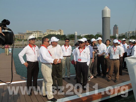 领队钟勇(左二)为国家体育总局肖天副局长(左三),深圳大运会执委会副主席、深圳大运会执行局局长梁道行(左五)等领导介绍深圳大运船队。